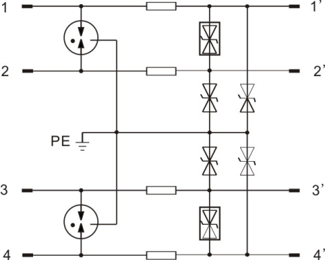 | 被保護(hù)腳 | 兩對線(1,2; 3,4) | |